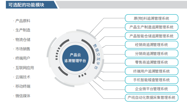 产品质量追溯系统利用先进的互联网技术和工具,通过普通数码、一维条码、二维条码、 RFID标签等方式对单个产品赋予唯一“身份证”,即追溯码,实现一物一码,对产品的生 产、仓储、分销、物流运输、市场及消费等各个环节进行数据采集与跟踪,实现产品生 产、销售融通及服务环节的全生命周期管理。 客户可以通过手机微信扫码、网站查询等方式了解产品相关信息。